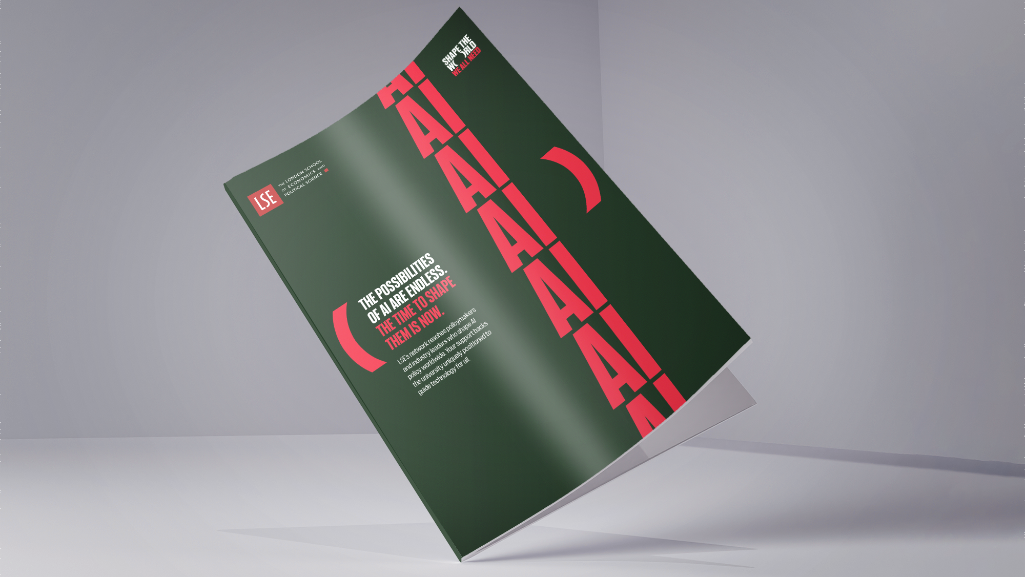 Visually the campaign needed to be bold and distinctive but also simple enough for the LSE internal team to implement on low budgets. The answer, an identity born from the campaign logotype. By expanding the ‘O’ in World we highlighted global challenges, and created a parenthesis that became a visual identifier, framing any image or headline. Accompanied by a bold approach to typography and a distinctive colour palette, the visual identity is now set to convey the urgency of the campaign and help the LSE team towards their goals.